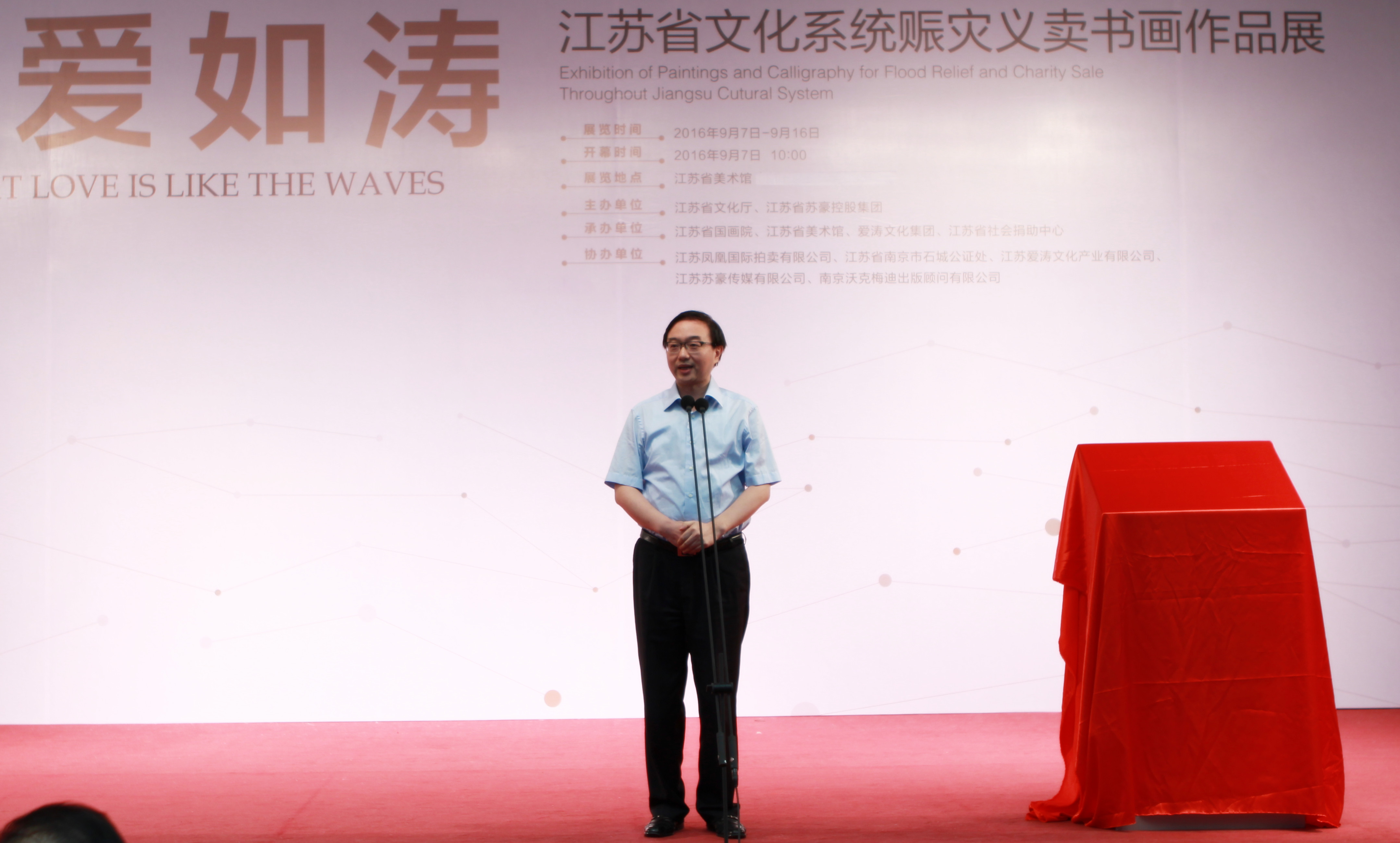 由江蘇省文化廳、江蘇省蘇豪控股集團共同主辦,江蘇省國畫院、江蘇省美術館、愛濤文化集團、江蘇省社會捐助中心共同承辦的“大愛如濤——江蘇省文化系統(tǒng)賑災義賣書畫作品展”,于9月7日在江蘇省美術館正式開幕,為期10天。并同步出版發(fā)行由蘇豪控股集團董事長王正喜主編的《大愛如濤——江蘇省文化系統(tǒng)賑災義賣書畫作品集》。