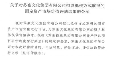 關(guān)于對蘇豪文化集團有限公司擬以抵償方式取得的固定資產(chǎn)市場價值評估結(jié)果的公示