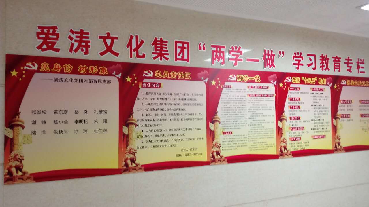 愛濤文化集團(tuán)各支部分散在不同的工作地點(diǎn),為增強(qiáng)“兩學(xué)一做”學(xué)習(xí)教育效果,將學(xué)習(xí)教育的內(nèi)容普及到全體黨員,各支部在不同的工作地點(diǎn)分別設(shè)立了《‘兩學(xué)一做’學(xué)習(xí)教育專欄》,并張貼在辦公區(qū)醒目的位置。宣傳欄內(nèi)容包括:“兩學(xué)一做”學(xué)習(xí)要點(diǎn);亮身份,樹形象,公示支部黨員名單;黨員責(zé)任區(qū)職責(zé);蘇豪控股“十三五”規(guī)劃;蘇豪控股企業(yè)文化等。同時,各支部還設(shè)立黨員示范崗、黨員責(zé)任區(qū),充分發(fā)揮共產(chǎn)黨員的先鋒模范作用,增強(qiáng)廣大黨員的黨員意識、責(zé)任意識和服務(wù)意識。