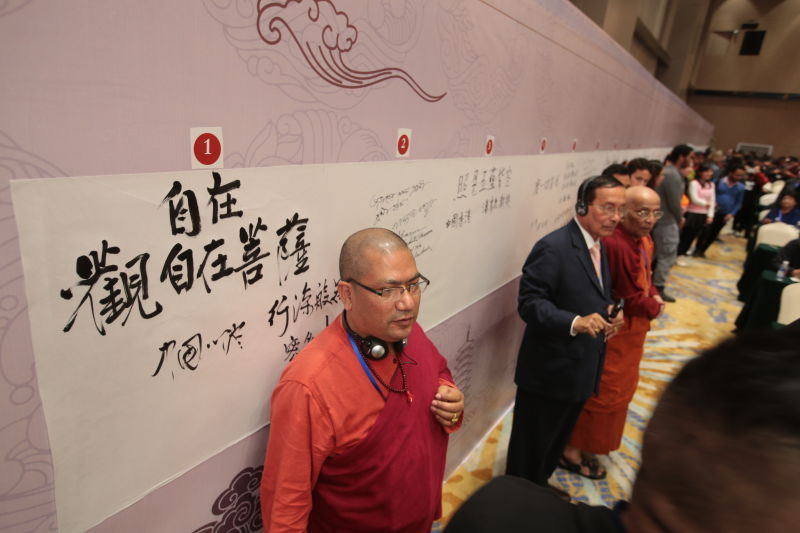 開幕式舉行了“一帶一路”沿線國家代表書寫《心經》儀式,來自30個國家的學者、高僧、大使館參贊、留學生代表共同用本國語言書寫了《心經》。并從多個角度加以研討,從這篇古代先哲引導人們追求至善至美至真的經文中感悟不朽的精神境界,意義十分重大。