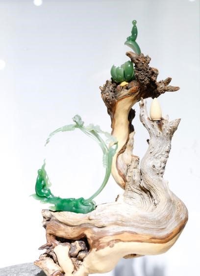 該作品創(chuàng)作靈感源于邊角料的極致運(yùn)用,整套作品的設(shè)計(jì)更跳脫以往一貫的思路,將玉器的設(shè)計(jì)視野擴(kuò)大到整體的擺設(shè)背景,將全面的視覺張力延伸,更強(qiáng)地展現(xiàn)作者想表現(xiàn)的意境。