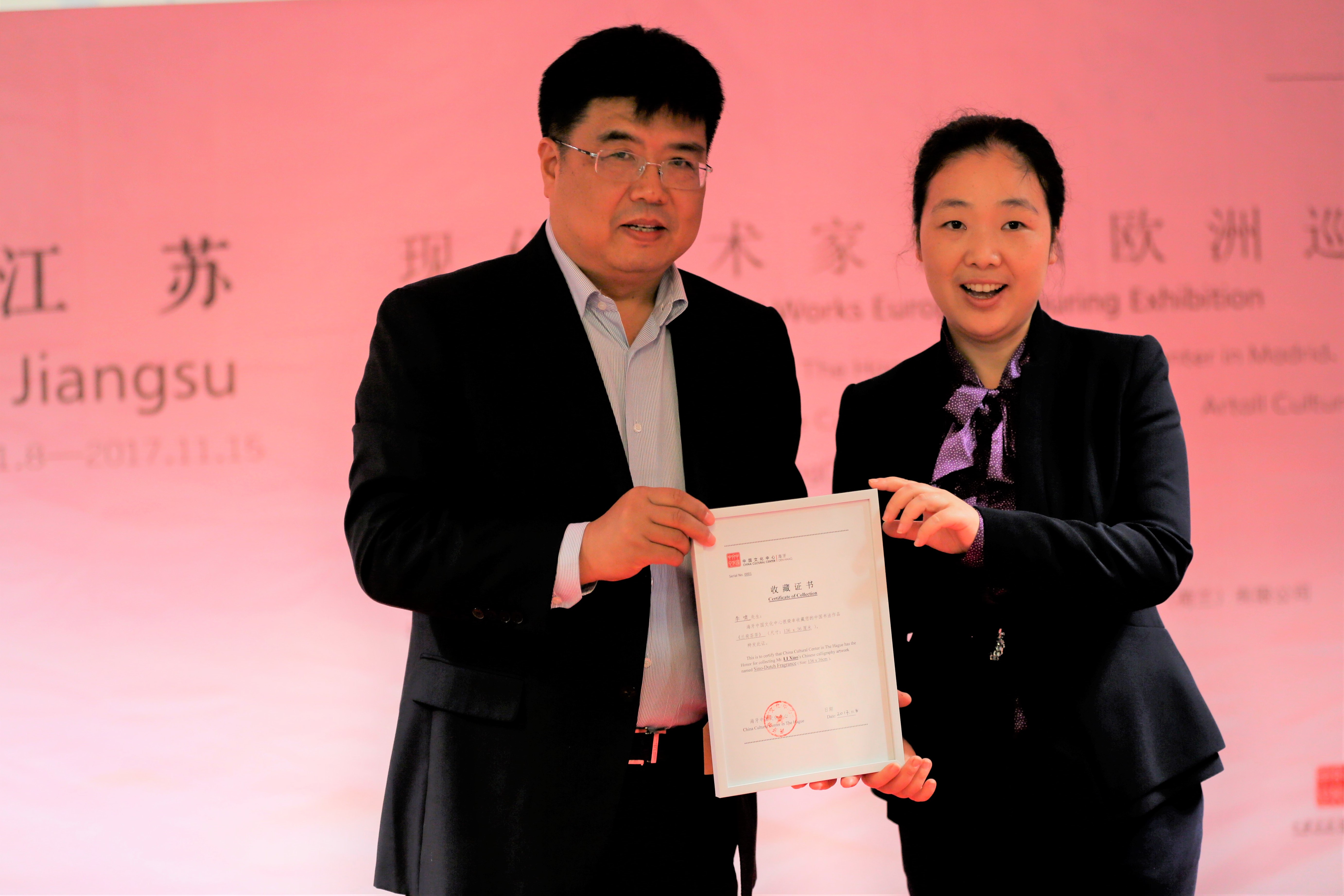 開幕儀式上,江蘇省書法院院長李嘯現(xiàn)場揮毫創(chuàng)作了《蘭荷芬芳》,并將該作品贈送給海牙中國文化中心。海牙中國文化中心主任孫蓓代表海牙中國文化中心接受了捐贈,并向李嘯院長頒發(fā)了《收藏證書》。