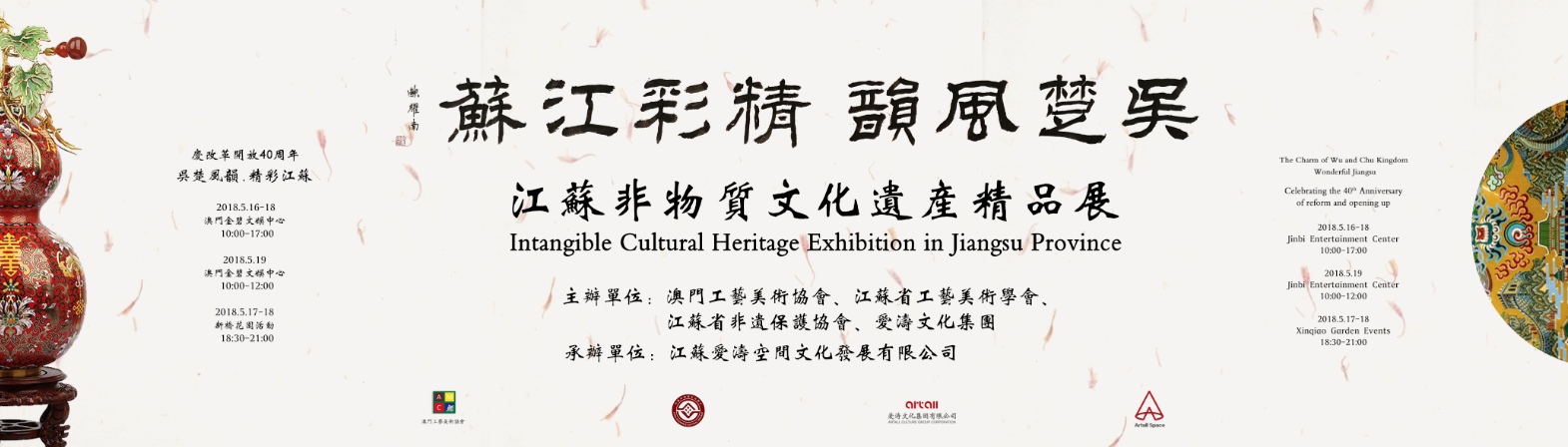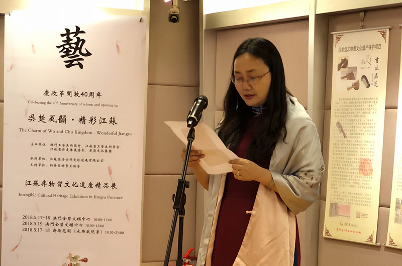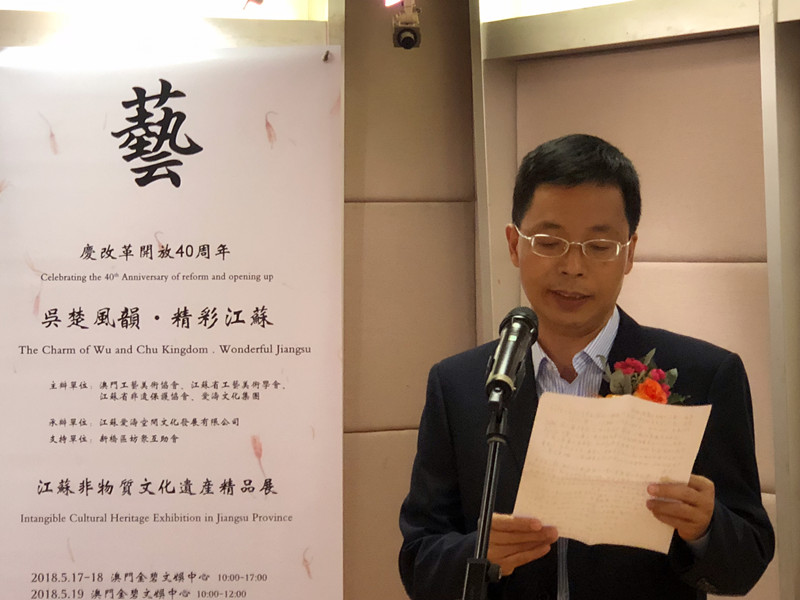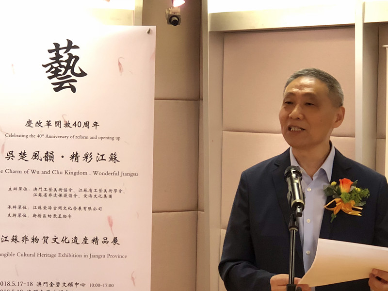 由澳門工藝美術(shù)協(xié)會、江蘇省工藝美術(shù)學會、江蘇省非遺保護協(xié)會、愛濤文化集團聯(lián)合主辦,江蘇愛濤空間文化發(fā)展有限公司承辦,澳門新橋區(qū)坊眾互助會協(xié)辦的文化部2018年內(nèi)地與港澳文化交流重點項目“慶改革開放40周年吳楚風韻.精彩江蘇澳門行--江蘇省非物質(zhì)文化遺產(chǎn)精品展”,5月16日至19日在澳門舉行。